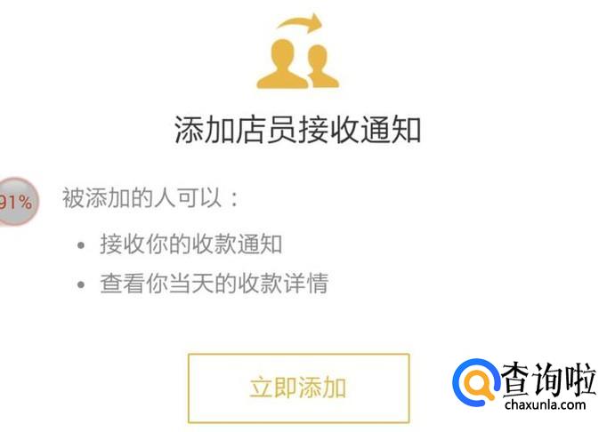 在这个界面右下角可以看到“添加店员收款通知”,点一下,下一个界面点“立即添加”。