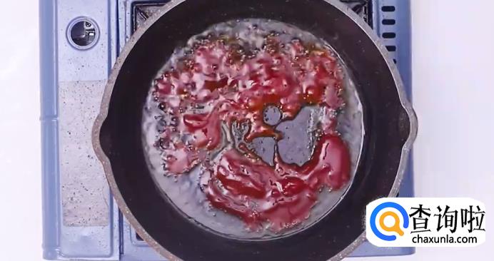 接下来,往锅中倒入20ML的清水,待水煮沸后,转至小火收汁。