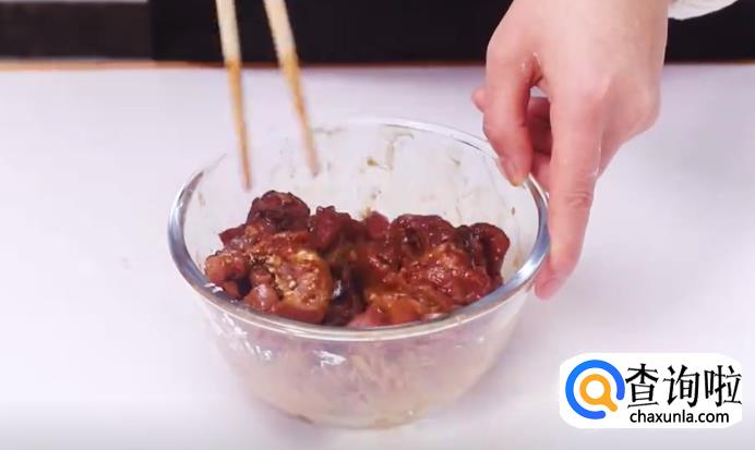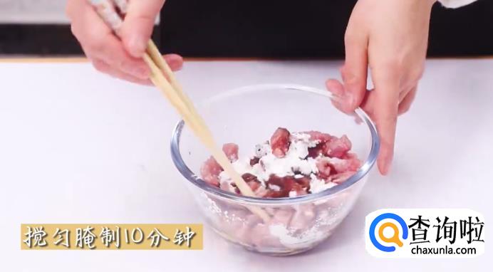 接着,在碗中加入料酒、老抽和淀粉,搅拌均匀后,放在一旁腌制10分钟。