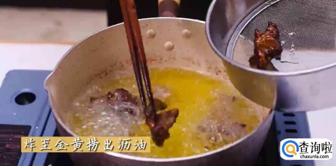 将油烧热,把腌制好的里脊肉放入锅中煎炸,炸至里脊肉呈金黄色,捞出来沥油。