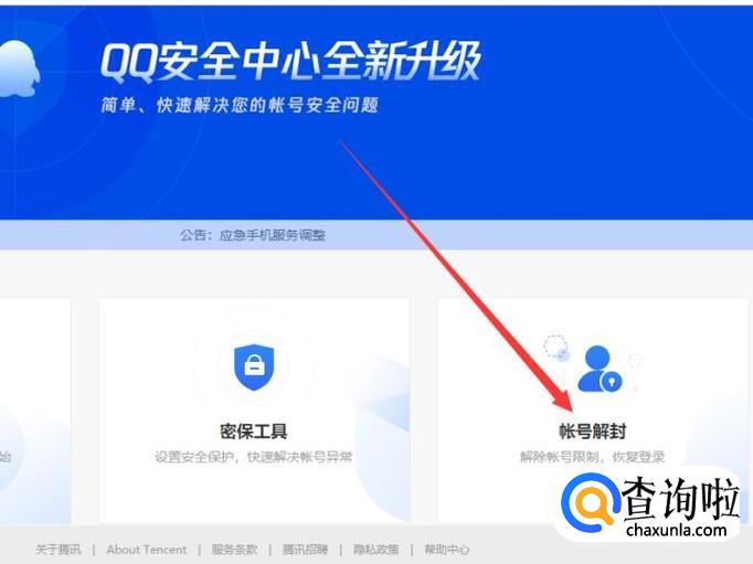 进入QQ安全中心官网,点击“账号解封”,如图所示。