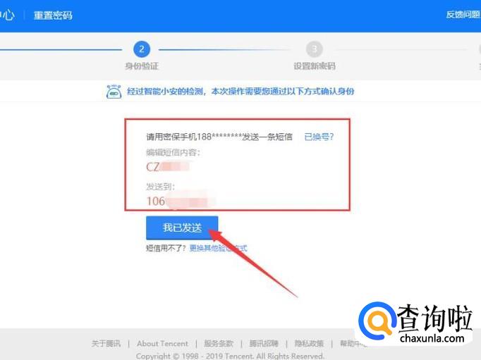 进入下一页面,用密保手机发送图示位置的短信,发送后点击“我已发送”。