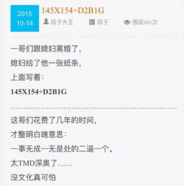 一哥们跟媳妇离婚了,媳妇给了他一张纸条,上面写着:145*154/d2b1g。这哥们花费了几年的时间才整明白啥意思:一事无成一无是处的二逼。