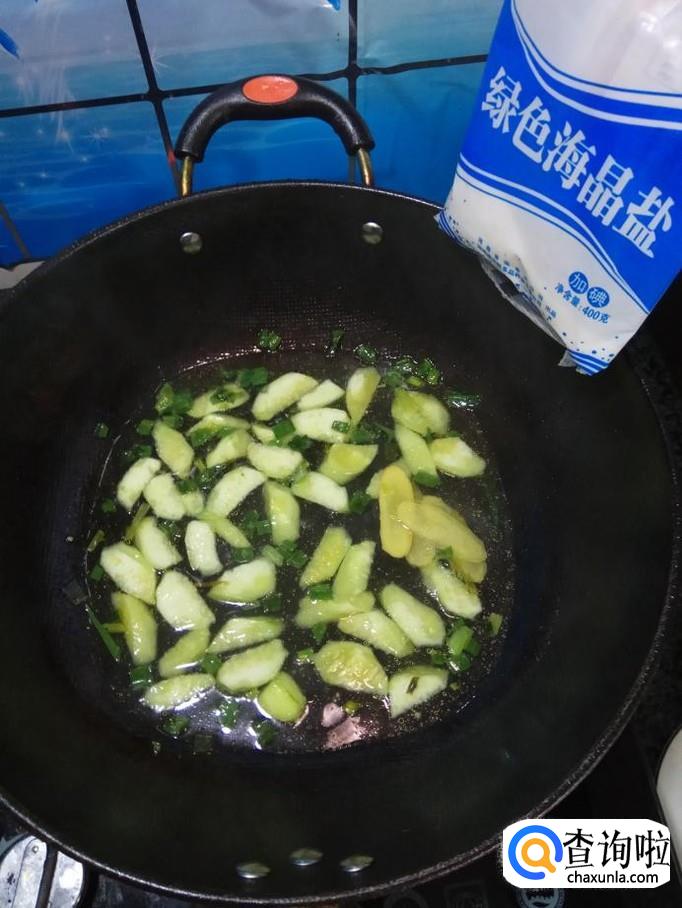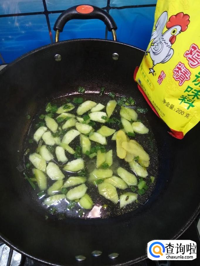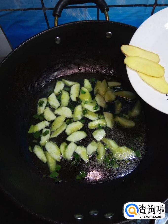 加入一碗清水,然后将准备好的姜片倒入锅中。
