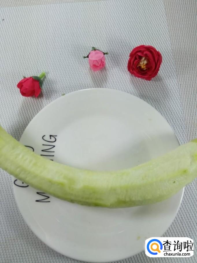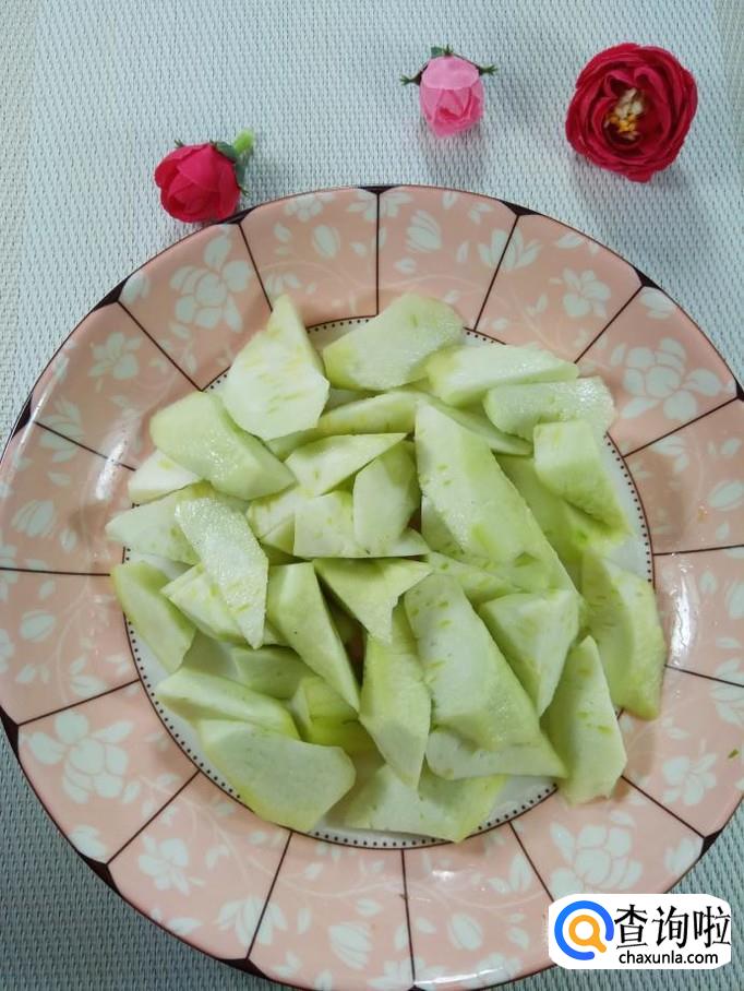 准备一根比较嫩的丝瓜,洗净去皮后,切成滚刀块,放入盘中备用。