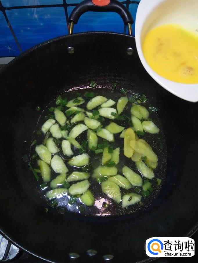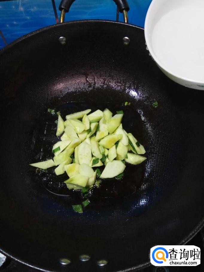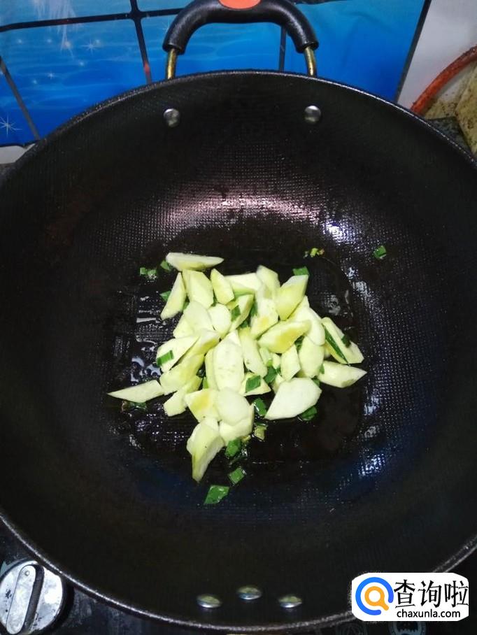 将准备好的丝瓜倒入锅中,翻炒均匀。