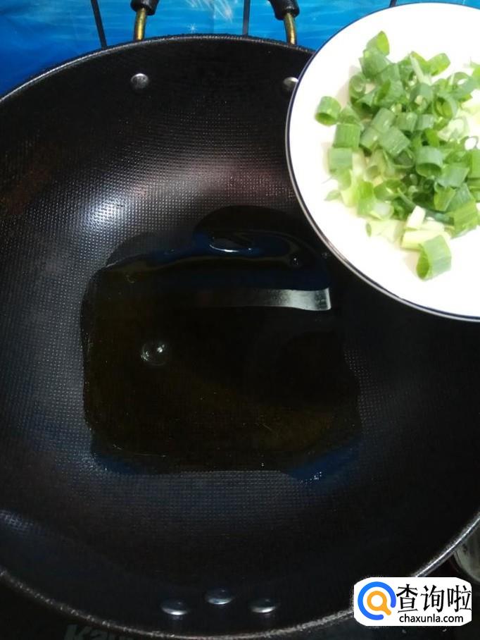 准备适量的葱和姜,洗净后,将葱切成葱圈,将姜切成片。炒锅中放入适量油,油热后,将葱圈倒入锅中炒香。