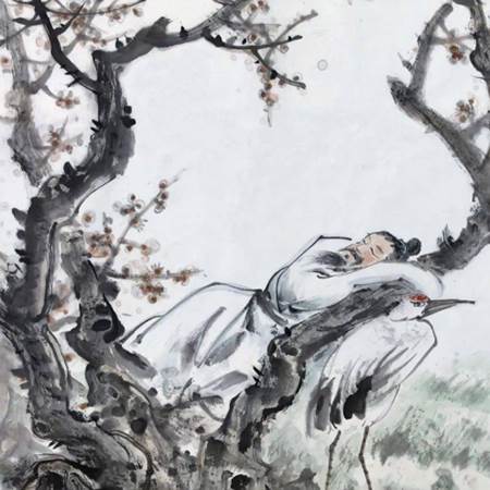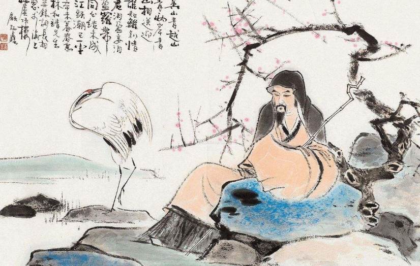 自称梅花是自己的妻子,白鹤是自己儿子的诗人是宋代诗人林逋。比喻隐逸生活和恬然自适的清高情态,也是中国传统绘画的常见题材之一。出自宋·沈括《梦溪笔谈·人事二》:“林逋隐居杭州孤山,常畜两鹤,纵之则飞入云霄,盘旋久之,复入笼中。逋常泛小艇,游西湖诸寺。有客至逋所居,则一童子出应门,延客坐,为开笼纵鹤。良久,逋必棹小船而归。盖尝以鹤飞为验也。”