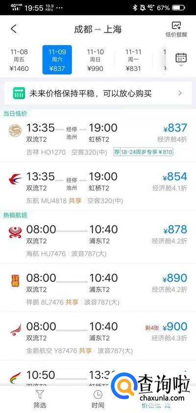 例如:成都到上海的经济舱全价票是837元。