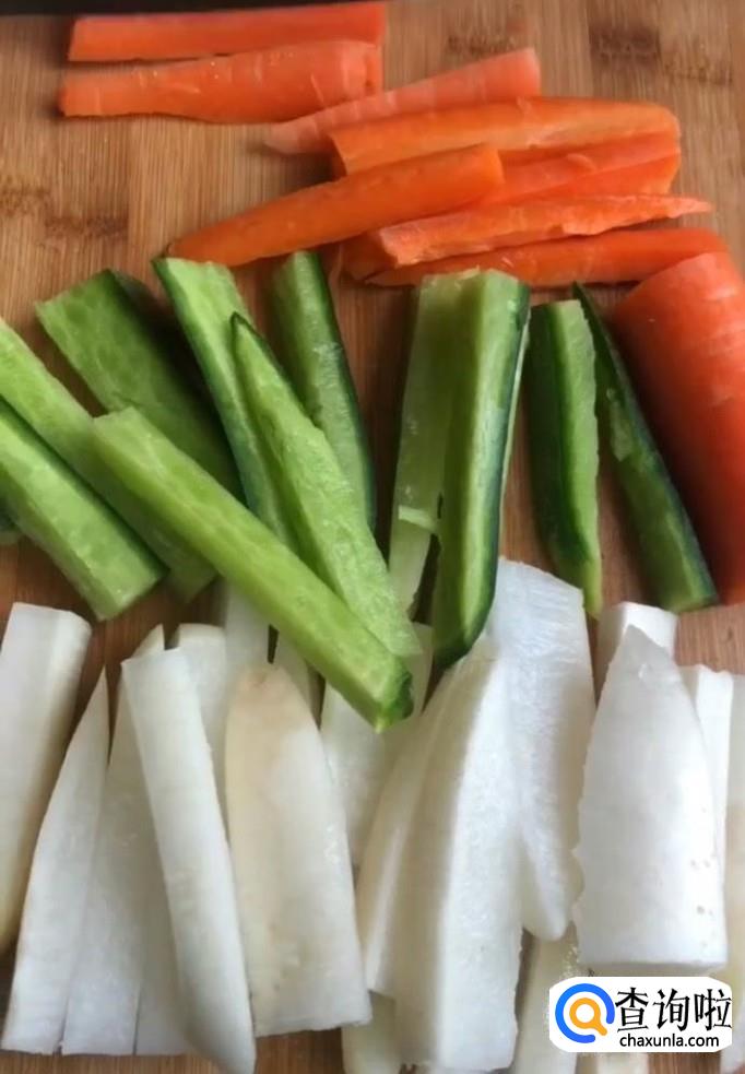 首先,我们将白萝卜,青萝卜,胡萝卜清洗干净,用刀切成条