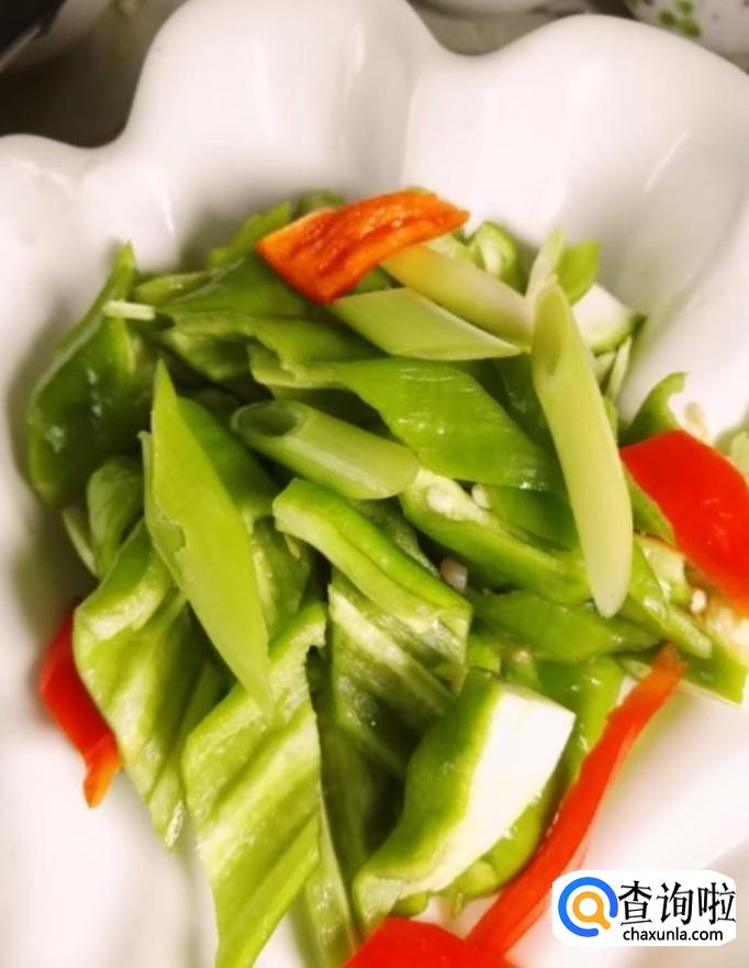然后我们将准备好的青椒与葱段放入锅中,加入适量的盐,鸡精调味,再加入少许白糖提鲜,翻炒两分钟左右关火