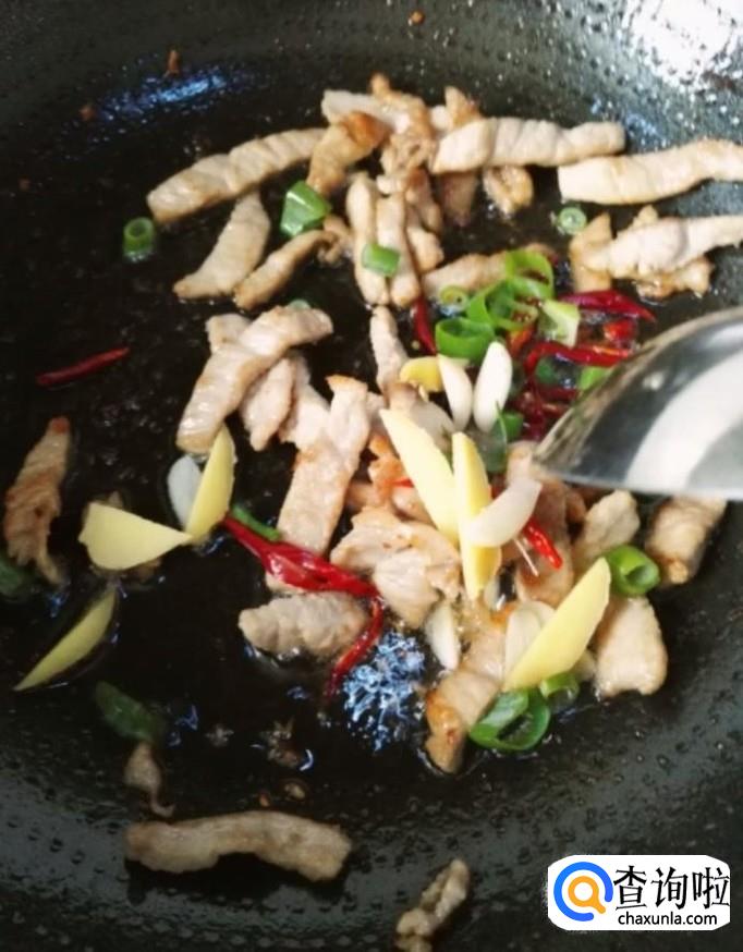 然后我们在锅中放入少许油,油热放入腊肉,再放入干辣椒,葱姜蒜,炒出香味