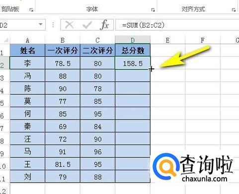 我们在在C2单元格中输入公式:=SUM(B2:C2)后,按下回车键,C2单元格显示出得数。鼠标再放在C2单元格右下角的填充柄这里,如图所示。