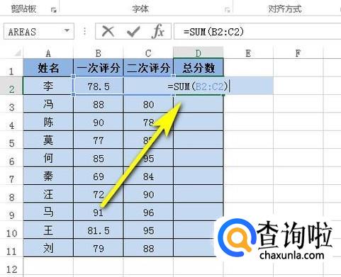 在C2单元格中输入公式:=SUM(B2:C2)