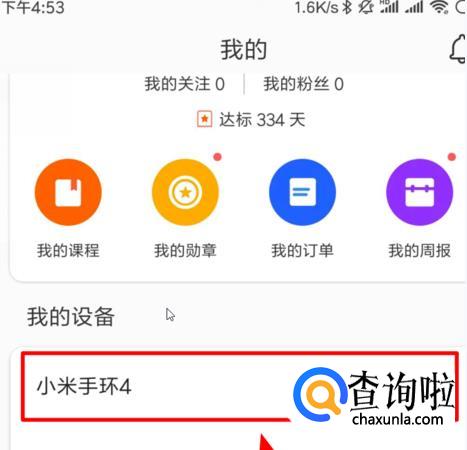 打开小米运动应用,点击下方我的,选择小米手环4设备进入;