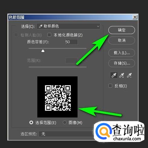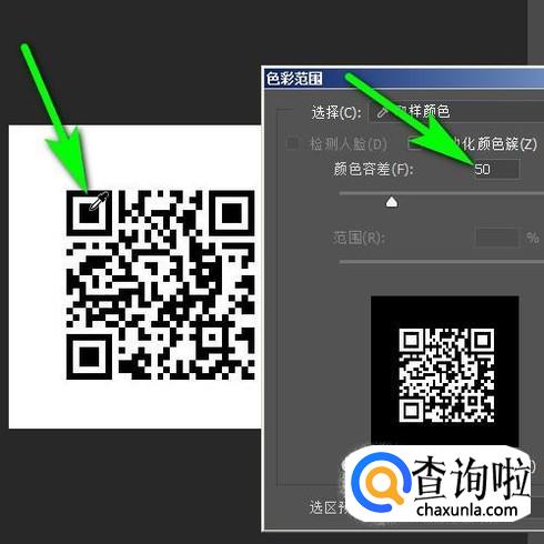 弹出操作面板,把容差设置为50;再把吸管放在画布的二维码上点击一下,吸取黑色。