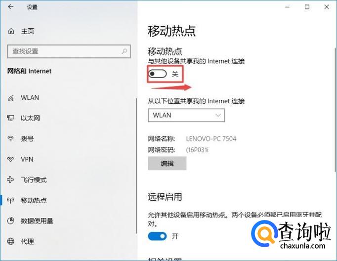 弹出的界面,我们将移动热点的开关向右滑动打开,这样我们就开启了笔记本的WIFI了。还是比较简单的,相信大家现在都会了。