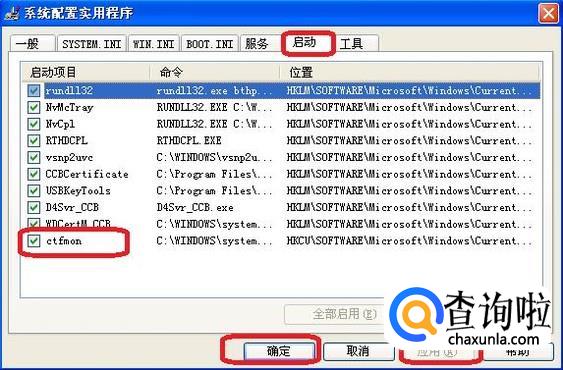 然后,在“启动”标签下,把配置文件“ctfmon”勾选上,点击应用、确定。重启下计算机,应该就显示输入法了。实在不行,我们就重装系统吧!