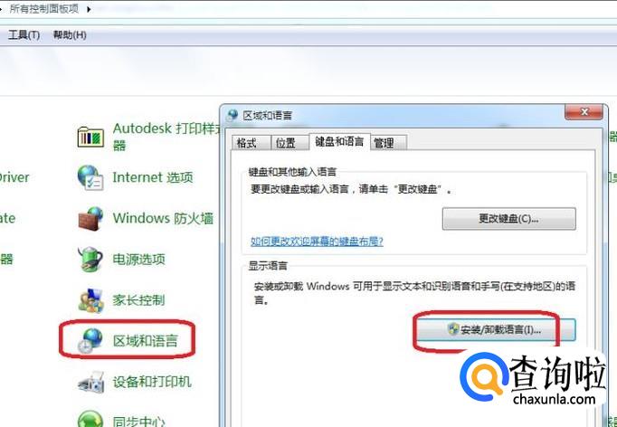 另外,也可以打开控制面板,如图所示,点击“区域和语言”,然后弹出相应面板后,点击“安装/卸载语言”,把语言重新安装一下,看能不能解决。