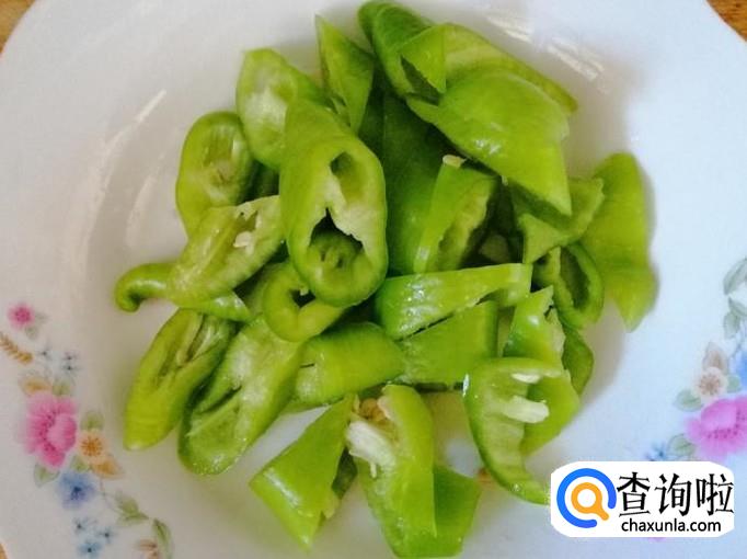取一个新鲜的尖辣椒,用清水把辣椒洗净,然后摘掉辣椒把,去辣椒籽,把辣椒切成滚刀块,切好备用。