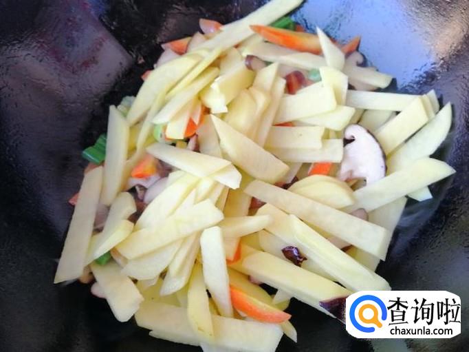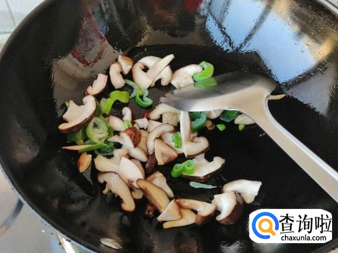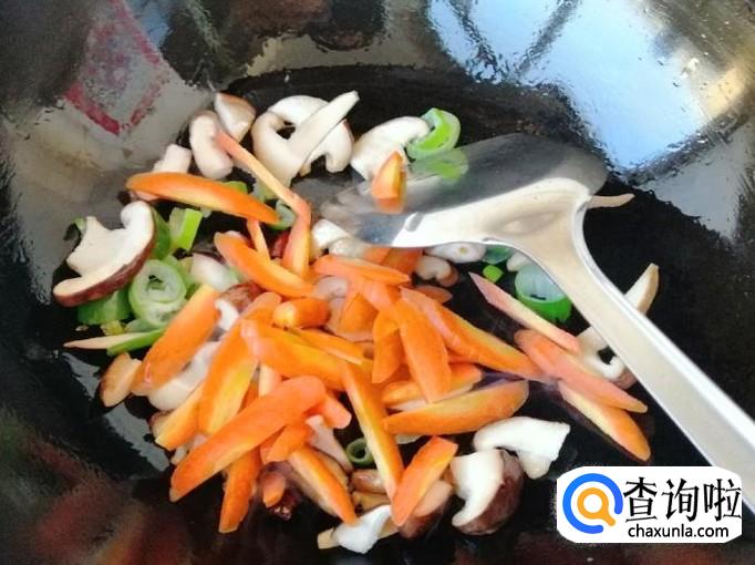 炒锅放油油热后,加入葱花和干辣椒炝锅,炒出香味后加入香菇,用铲子快速翻炒均匀,然后加入胡萝卜翻炒,接着加入土豆片。
