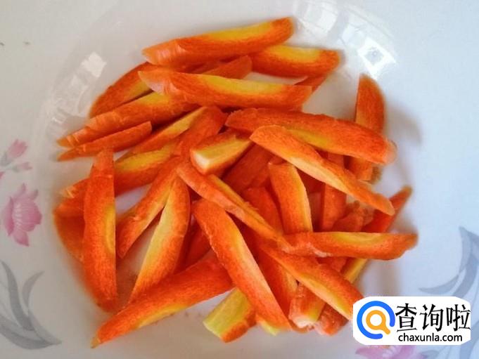 取适量新鲜的胡萝卜,用清水把胡萝卜洗净,然后用刀切掉胡萝卜两头,把胡萝卜切条待用。