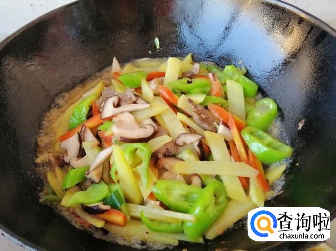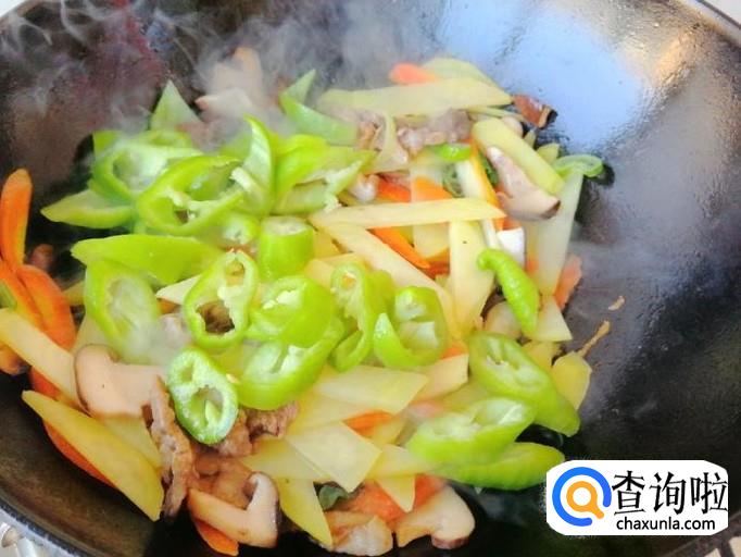 加入适量熟猪肉,翻炒均匀,可以适量加点热水翻炒,然后加入尖椒,加入生抽和食盐,翻炒入味,这样我们的,辣椒土豆胡萝卜香菇炒肉就做好了,鲜香微辣特别美味,把炒好的菜出锅入盘就可以开吃了。