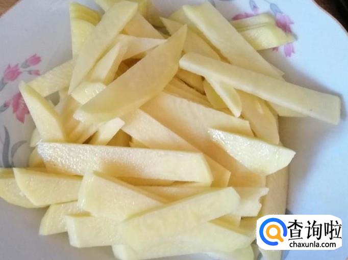 取一个新鲜的土豆网,用清水把土豆洗净,然后用刮刀去皮,把土豆切成土豆片或条,切好备用。