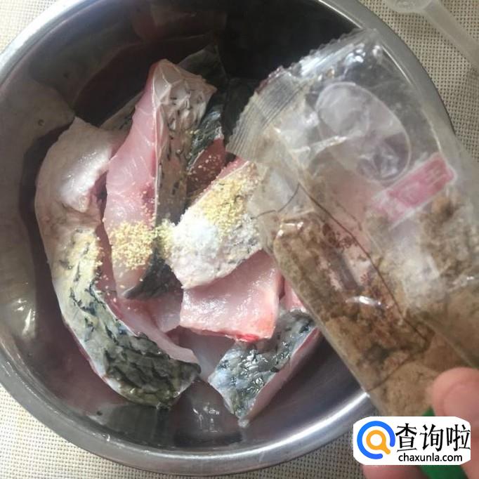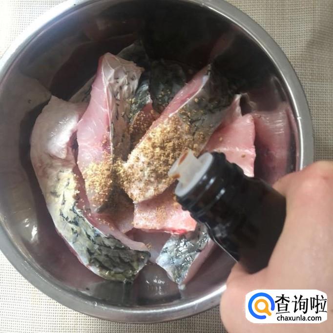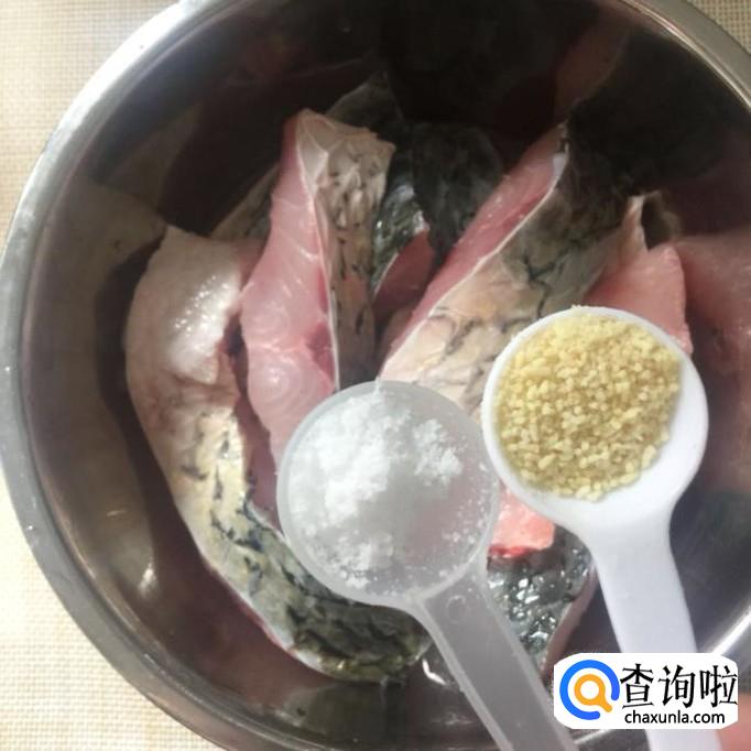 然后在草鱼面上撒入适量的盐巴、味精、五香粉和酱油搅拌均匀,腌一个小时。
