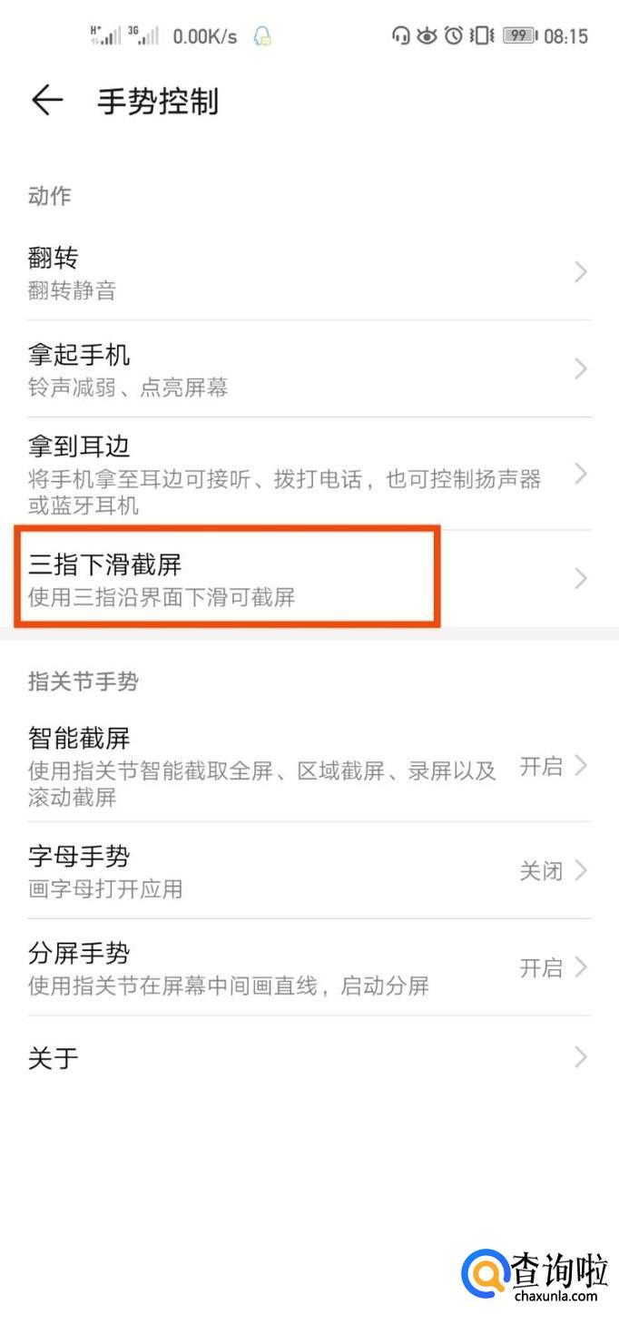 点击手势控制之后,进入下一界面就可以看到“三指下滑截屏”这个选项,点击进入。