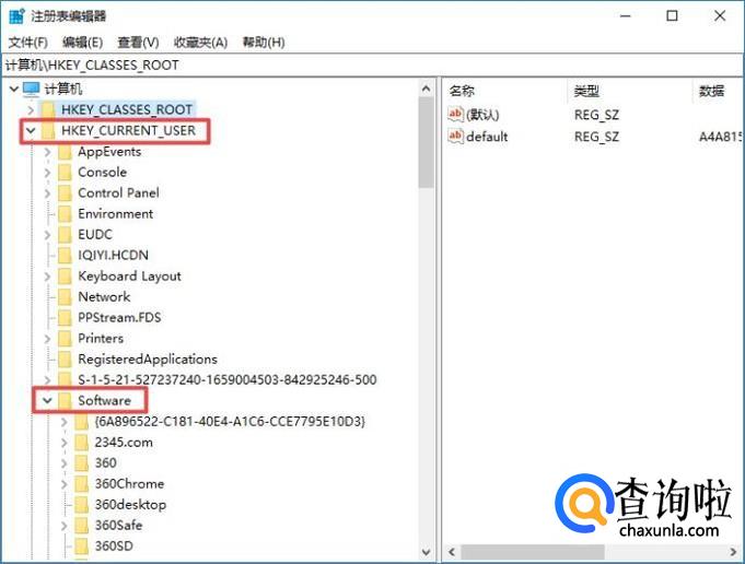 之后我们点击打开HKEY_CURRENT_USER,然后点击打开Software;