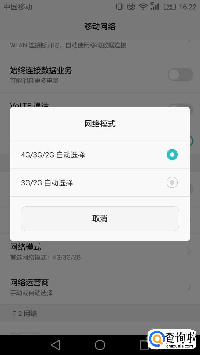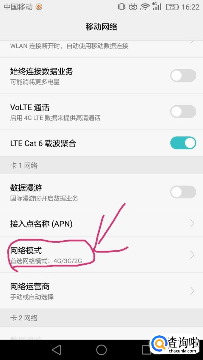 进入移动网络界面后,向下滑动,可以看到网络模式。