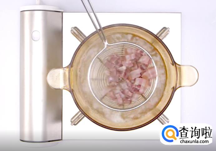 装一锅水,大火煮沸,然后将切好的咸肉丁放入锅中煮熟,煮熟后捞出沥干。