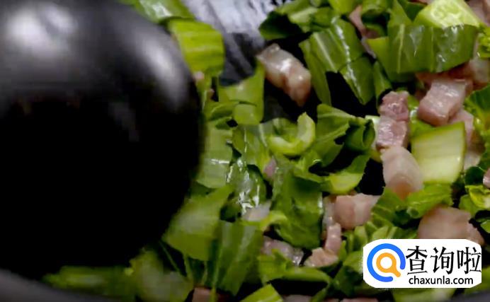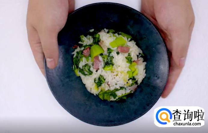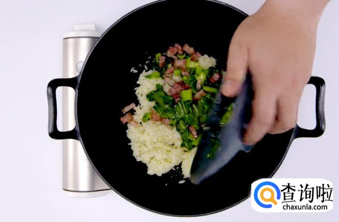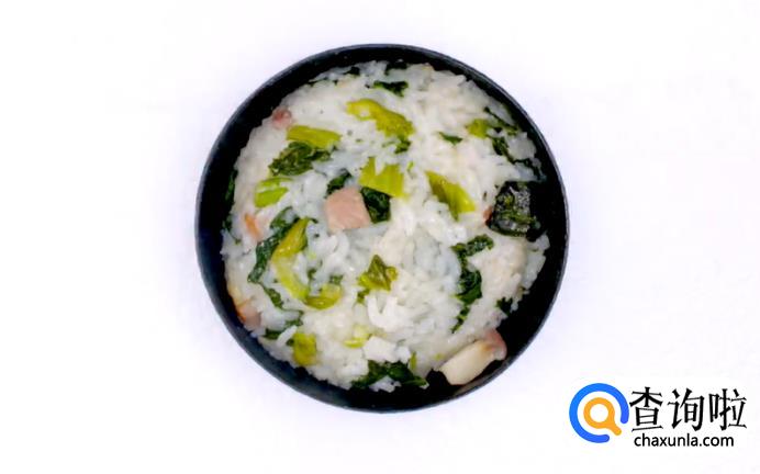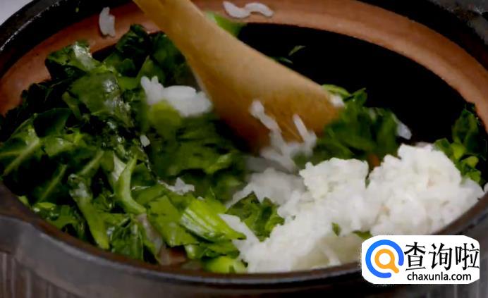 米饭咸肉煮熟后,将青菜加入进去,拌进饭里。