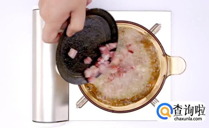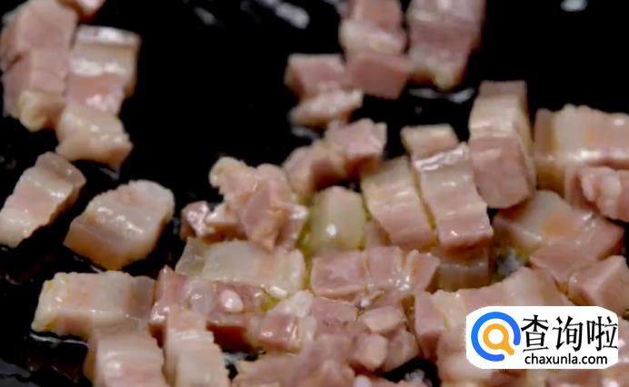 接着,将炒锅烧热,将咸肉丁放入煸炒,直至出油为止。