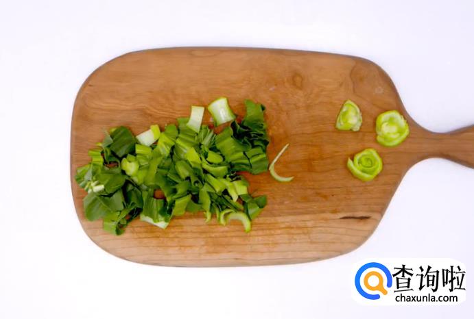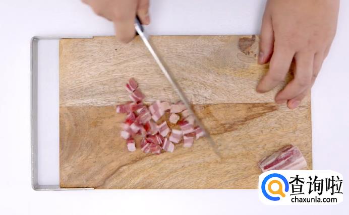 接着,将准备好的青菜洗干净切碎,再把咸肉切成丁。