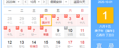 2020年国庆中秋放假从10月1日(星期四)至8日(星期四)放假调休,共8天。9月27日(星期日)、10月10日(星期六)上班。