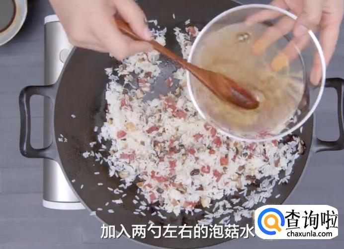 加两勺左右的泡菇水,继续翻炒至糯米水分变干。
