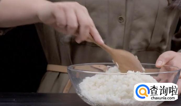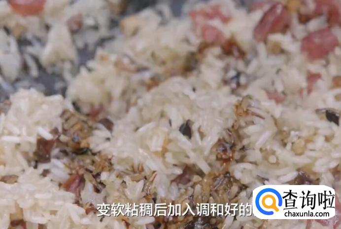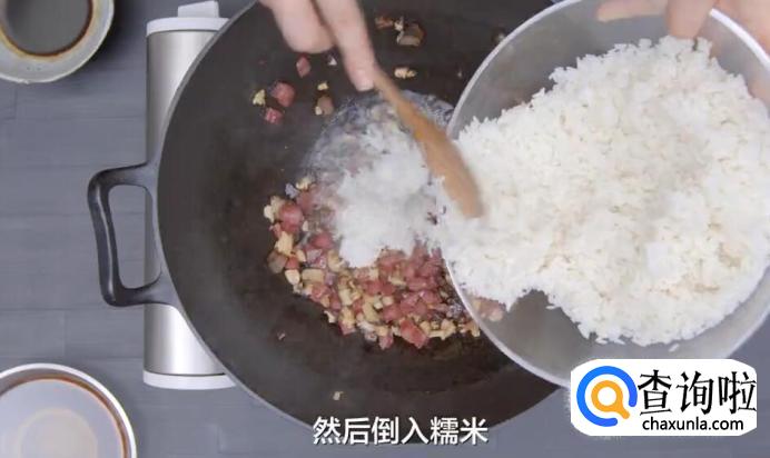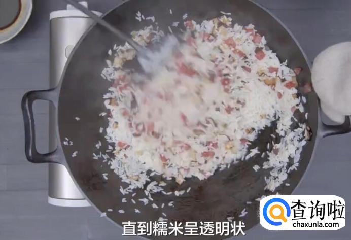 然后倒入糯米饭,保持中火不断翻炒,一直炒到米粒均匀沾裹油脂。