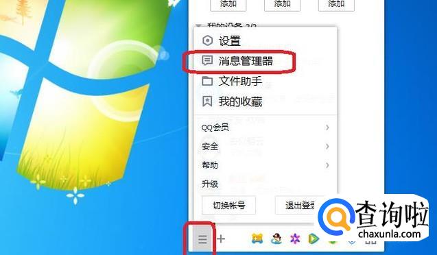 首先,我们打开QQ,如图所示,点击QQ主面板左下角图标,弹出菜单,点击“消息管理器”。
