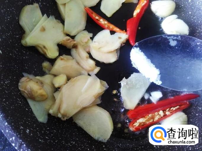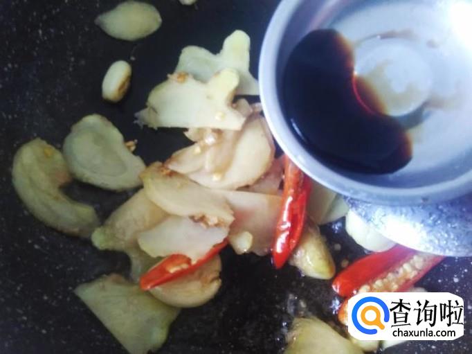 开火下油,放蒜、姜片、小米辣进去加适量的盐翻炒一下,然后下小半勺生抽进去。