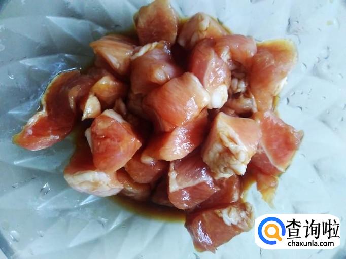 瘦肉切成小丁,加适量的盐、生抽、料酒腌制几分钟。