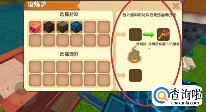 然后把鸡腿放到熔炼炉里,加上一些燃料,烧制成烤鸡腿。