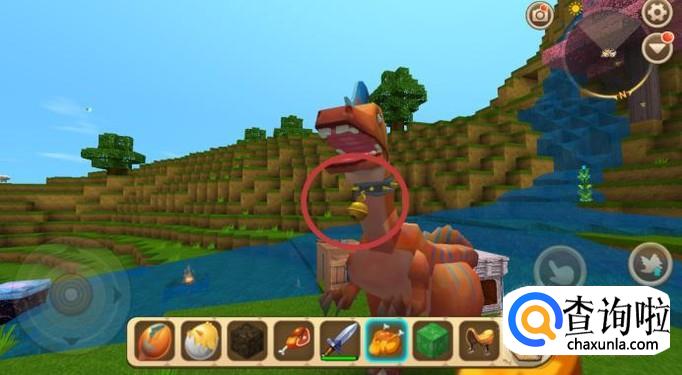 然后用短剑等武器去攻击迅猛龙,等到迅猛龙快不行的时候用烤全鸡喂它,迅猛龙就不会再攻击你了,被驯服后的迅猛龙脖子上会出现一个铃铛,如图所示。