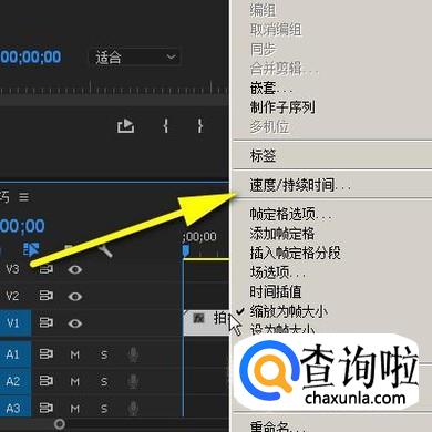 视频自动放在视频轨道1中。鼠标放在视频素材上面,并且右击。弹出一列菜单。在菜单中点击:速度/持续时间