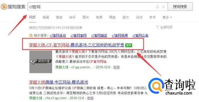 打开搜狗浏览器,输入cf官网,然后点击进入官网,如下图。