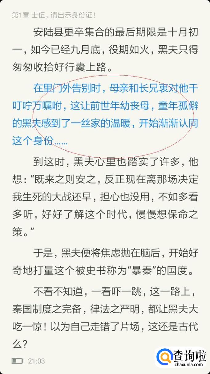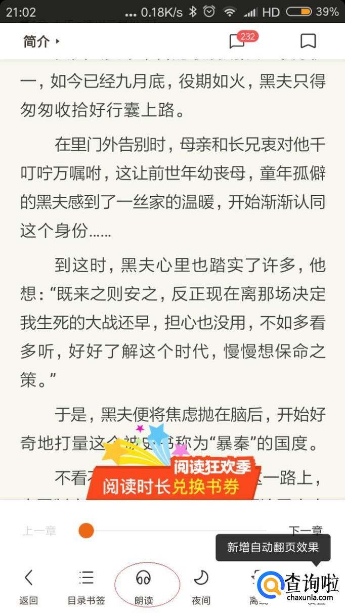 如图所示,唤出小说阅读界面。点击中间区域任意位置,唤出工具栏选择"朗读"项。