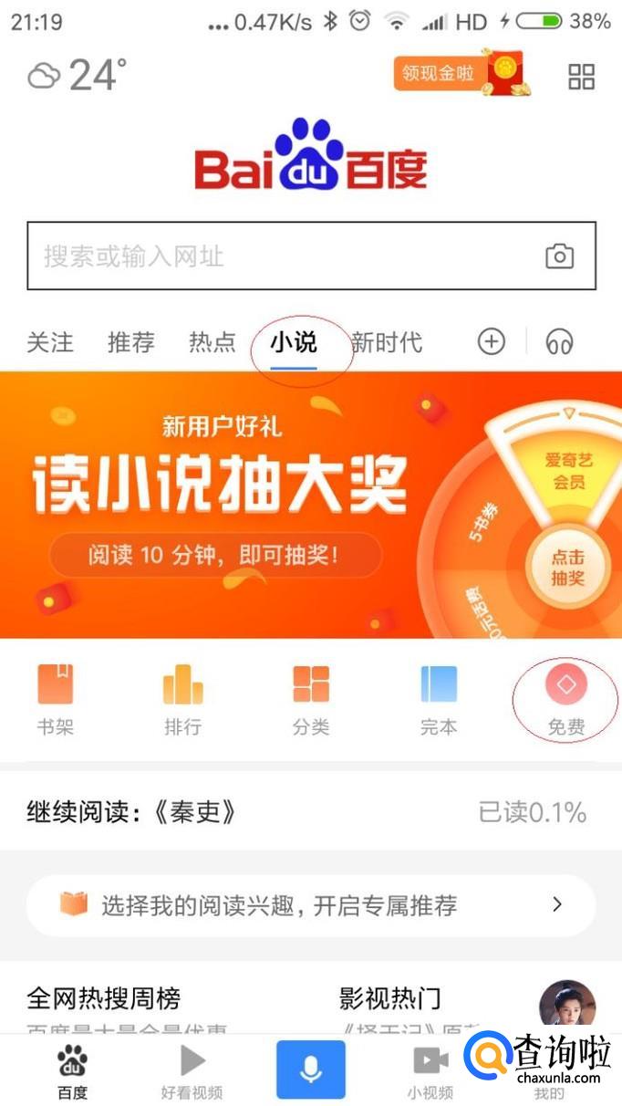 如图所示,唤出"手机百度→小说"选项界面。垂直滑动选项区域,点击"免费"图标。