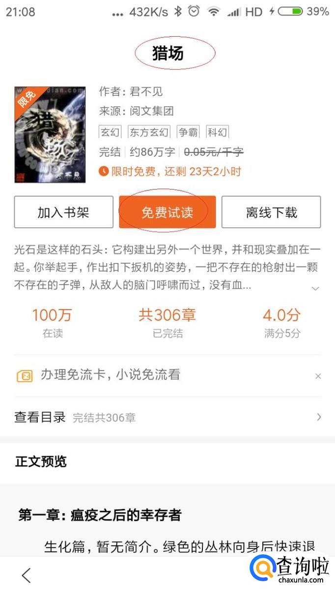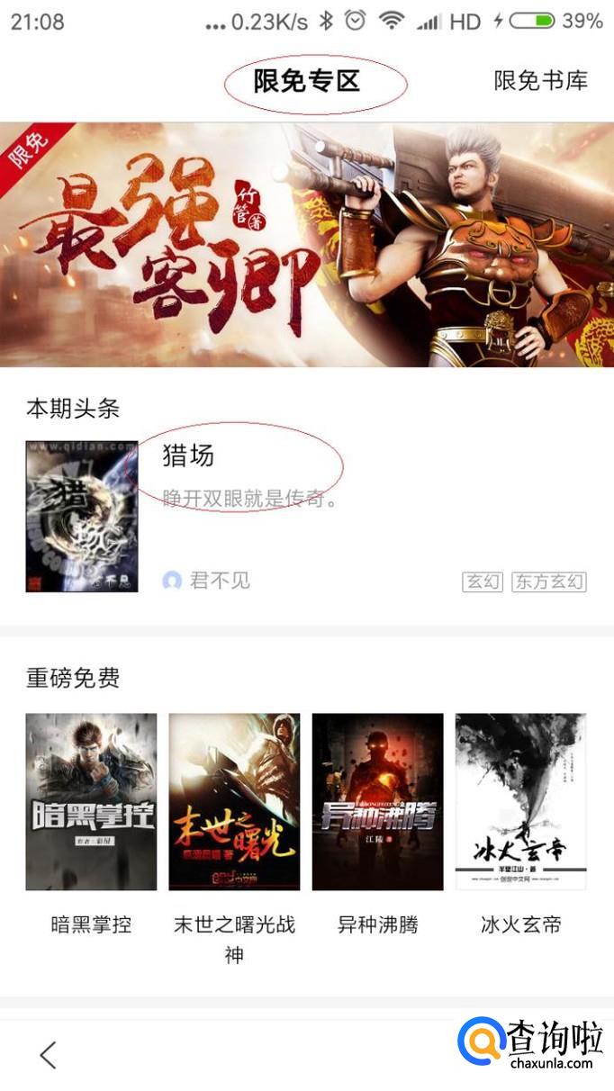 唤出"限免专区"选项界面,如图所示。点击"猎场→免费试读"按钮,下步将进行开启朗读功能听小说的操作。