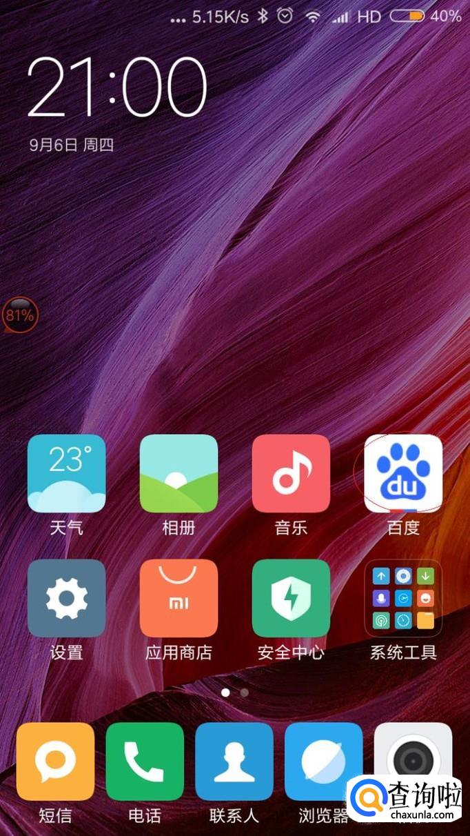 启动智能手机系统,如图所示。唤出用户主界面,点击"百度"图标。